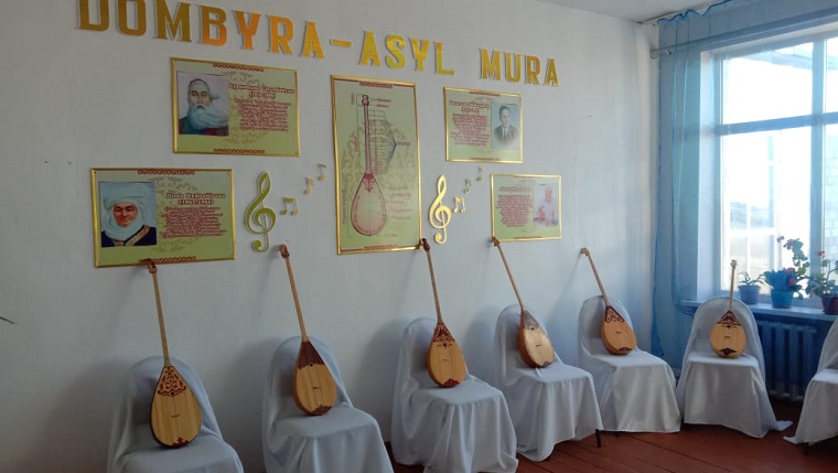 Қос ішекті қара домбыраның үнінде дархан даланың тамыры терең тарихы мен сан ғасырлық шежіресі бар. Ұлттық өнерді насихаттауға үлес ретінде ашылған кабинет қазақ күйшілері, жерлес композиторлар туралы стендтермен жабдықталған. Мектеп түлектері тарту еткен домбыралар мен көнеден келе жатқан ұлттық аспаптар кабинеттің мәнін ашып, сән-салтанатын келтіріп тұр. Домбыра кабинеті алдағы уақытта осынау ұлт болмысын сақтап, рухани құндылықтарымыздың арқауы үзілмеуіне дәнекер болар өнерлі дарабоздар дайындауда жұмысын жалғастырмақ.
